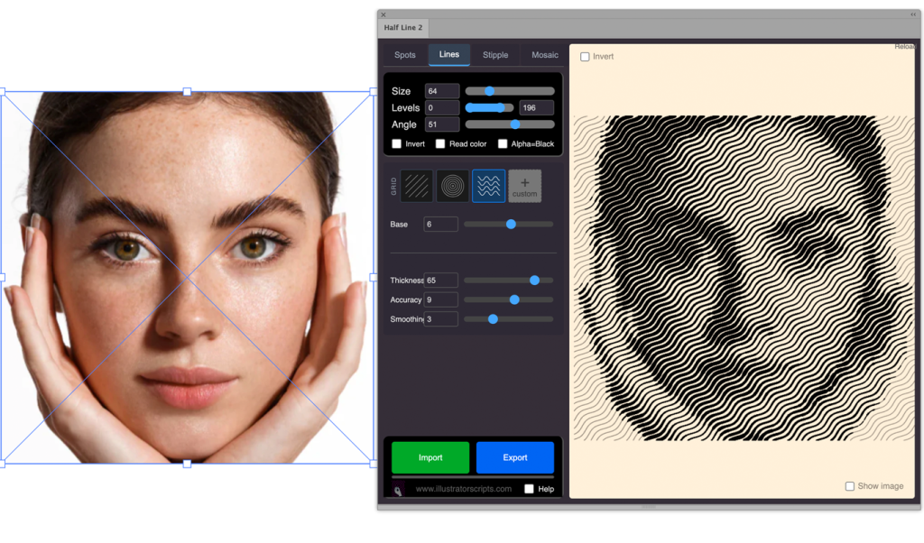 Select a raster image (or any vector artwork) in Illustrator, then click Import in the panel. Half Line 2 analyses the selection and builds a live preview immediately. Adjust any setting — mode, density, shape, color — and the preview updates in real time. When you are happy with the result, click Export and the halftone artwork is placed directly onto your artboard as native Illustrator paths.