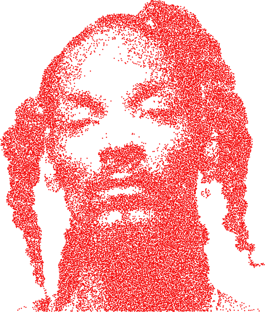 Stipple — or stochastic halftone — places dots whose density encodes luma rather than size. Dark areas receive more dots, bright areas fewer. The result reads as hand-drawn pointillism or traditional pen stippling.